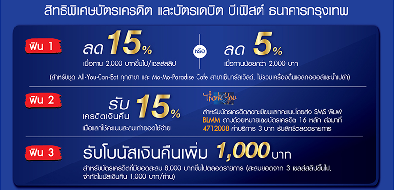 - ใช้บัตรเครดิต หรือบัตรเดบิต บีเฟิสต์ ธนาคารกรุงเทพ ชำระค่าอาหารที่โมโม พาราไดซ์ ทุกสาขา รับส่วนลด 15% สำหรับยอดใช้จ่าย 2,000 บาทขึ้นไป/เซลส์สลิป หรือ รับส่วนลด 5% สำหรับยอดใช้จ่ายน้อยกว่า 2,000 บาท/ เซลส์สลิป (สำหรับชุด All-You-Can-Eat ทุกสาขา และ Mo-Mo-Paradise Cafe สาขาเซ็นทรัลเวิลด์, ไม่รวมเครื่องดื่มแอลกอฮอล์และน้ำเปล่า)