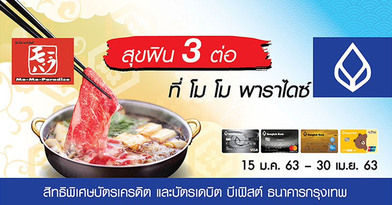 - สำหรับผู้ถือบัตรที่ใช้จ่ายผ่านบัตรเครดิตและบัตรเดบิต บีเฟิสต์ ธนาคารกรุงเทพ ยอดรวมสูงสุด 11 ท่านแรก ที่ร้าน Mo-Mo-Paradise ทุกสาขาระหว่างวันที่ 15 ม.ค. 63 - 30 เม.ย. 63 โดยมียอดใช้จ่ายรวมตลอดรายการขั้นต่ำ 15,000 บาทขึ้นไป