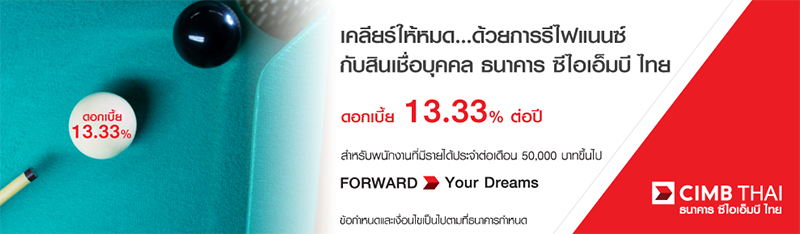 เคลียร์หนี้ให้หมด...ด้วยการรีไฟแนนซ์ กับสินเชื่อบุคคล ธนาคาร ซีไอเอ็มบี ไทย ดอกเบี้ย 13.33% ต่อปี