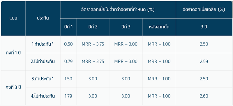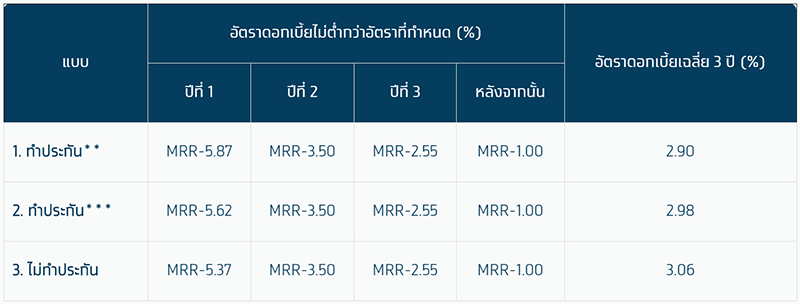 ทำประกัน คือ ทำ MRTA / GLTSP เต็มวงเงินกู้ และระยะเวลาทำประกันขั้นต่ำ 10 ปี หรือทำ MRTA / GLTSP70% ของวงเงินกู้และระยะเวลากู้ หรือระยะเวลาทำประกันขั้นต่ำ 15 ปี ทั้งนี้ การทำประกันชีวิตเพื่อคุ้มครองวงเงินสินเชื่อเป็นไปตามความสมัครใจของลูกค้า และไม่มีผลต่อการพิจารณาสินเชื่อ