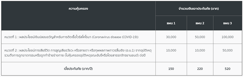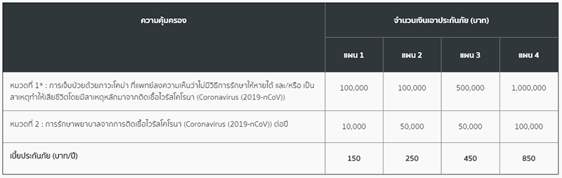 หมายเหตุ : บริษัทขอสงวนสิทธิ์ในการแจ้งเปลี่ยนแปลงเงื่อนไขความคุ้มครองและเบี้ยประกันภัย กรณีที่สถานการณ์การระบาดของโรคมีความรุนแรงเพิ่มขึ้น โดยจะแจ้งให้ทราบล่วงหน้า 7 วัน ก่อนมีการเปลี่ยนแปลงเงื่อนไขหรือเบี้ยประกันภัย