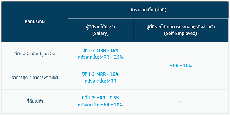 หมายเหตุ : ระยะเวลาให้กู้สูงสุด 15 ปี ทั้งนี้ หลักประกันต้องปลอดภาระการจำนอง ยกเว้น กรณีก Refinance จากสถาบันการเงินอื่น