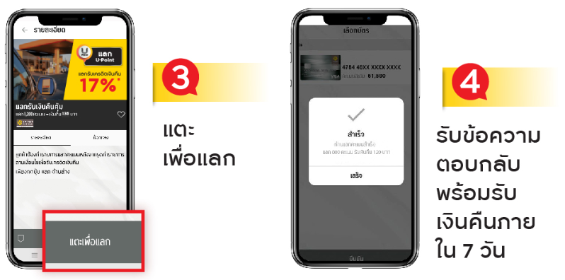แลกพอยต์หลังรูดทำรายการภายในวันอาทิตย์ของสัปดาห์ที่ทำรายการ (ฟรีค่าบริการ) ผ่านช่องทางแอปพลิเคชัน UChoose เท่านั้น : พิมพ์คำค้นหาโปรโมชั่นว่า "PTT2" และรอรับข้อความตอบกลับยืนยันการหักพอยต์ถือว่าเข้าร่วมรายการสำเร็จ