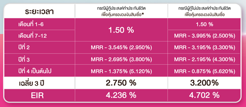 - อัตราดอกเบี้ยที่แท้จริงตลอดอายุสัญญา (EIR) คำนวณจากวงเงินกู้ 1,500,000 บาท ระยะเวลาผ่อนชำระ 20 ปี