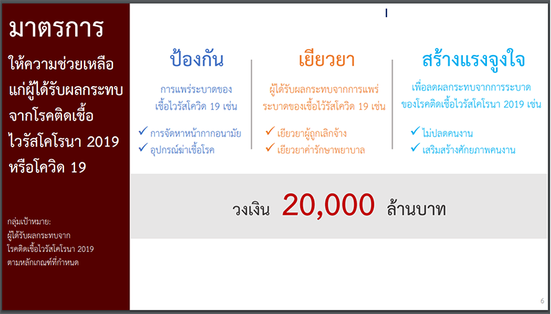 3.6 มาตรการให้ความช่วยเหลือแก่ผู้ได้รับผลกระทบจากโรคติดเชื้อไวรัสโคโรนา 2019 หรือโควิด 19 โดยกำหนดให้มีแนวทางให้ส่วนราชการสามารถจ่ายเงินเพื่อป้องกัน เยียวยา สร้างแรงจูงใจในการคงการจ้างงาน รวมถึงการพัฒนาศักยภาพของผู้ที่ได้รับผลกระทบจากโรคติดเชื้อไวรัสโคโรนา 2019 เป็นการเฉพาะและเร่งด่วน โดยได้เตรียมวงเงิน 20,000 ล้านบาท จากงบกลาง เพื่อรองรับการดำเนินการดังกล่าวเป็นการเฉพาะ