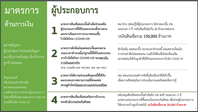 1.3 มาตรการให้ความช่วยเหลือลูกหนี้ที่ได้รับผลกระทบจากสถานการณ์ที่ส่งผลต่อเศรษฐกิจไทย โดยธนาคารแห่งประเทศไทย (ธปท.) ได้ออกแนวทางในการให้ความช่วยเหลือลูกหนี้ที่ได้รับผลกระทบจากสถานการณ์ที่ส่งผลกระทบต่อเศรษฐกิจไทย เพื่อให้สถาบันการเงินและบริษัทลูกในกลุ่ม สถาบันการเงินเฉพาะกิจรวมถึงผู้ประกอบธุรกิจที่ให้สินเชื่อที่มิใช่สถาบันการเงิน เร่งดำเนินการให้ความช่วยเหลือลูกหนี้ในเชิงรุกอย่างทันเหตุการณ์ เช่น ผ่อนปรนเกณฑ์การจัดชั้นสินเชื่อปกติ เพิ่มความยืดหยุ่นในการอนุมัติเงินกู้ เพื่อให้ลูกหนี้มีสภาพคล่องเพียงพอในการดำเนินธุรกิจหรือดำเนินชีวิตประจำวันต่อไปได้
