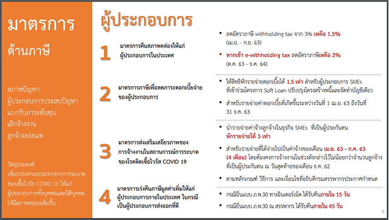2.1 มาตรการคืนสภาพคล่องให้แก่ผู้ประกอบการในประเทศ โดยลดอัตราภาษีเงินได้หัก ณ ที่จ่ายจากอัตราร้อยละ 3 เหลืออัตราร้อยละ 1.5 สำหรับการจ่ายเงินได้พึงประเมินตั้งแต่วันที่ 1 เมษายน 2563 ถึงวันที่ 30 กันยายน 2563 และลดเหลืออัตราร้อยละ 2 สำหรับการจ่ายเงินได้พึงประเมินตามข้อกำหนด ตั้งแต่วันที่ 1 ตุลาคม 2563 ถึงวันที่ 31 ธันวาคม 2564 ที่จ่ายผ่านระบบการหักภาษี ณ ที่จ่ายทางอิเล็กทรอนิกส์ (e-Withholding Tax)