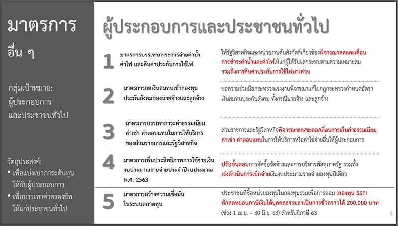 มาตรการลดเงินสมทบเข้ากองทุนประกันสังคมของนายจ้างและลูกจ้าง/มาตรการสร้างความเชื่อมั่นในระบบตลาดทุน โทร. 0-2273-9020 ต่อ 3643