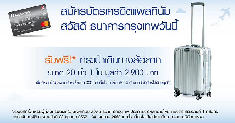 สมัครบัตรเครดิตแพลทินัม สวัสดี วันนี้ รับฟรี! กระเป๋าเดินทางล้อลาก มูลค่า 2,900 บาท วันนี้ - 30 เม.ย. 63