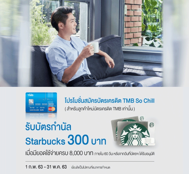 บัตรเครดิต ทีเอ็มบี โซ ชิลล์ (TMB So Chill Credit Card) วันนี้...รับบัตรกำนัล Starbucks มูลค่า 300 บาท เมื่อมียอดใช้จ่ายครบ 8,000 บาทขึ้นไป ภายใน 60 วัน นับจากวันที่บัตรฯ ได้รับการอนุมัติ