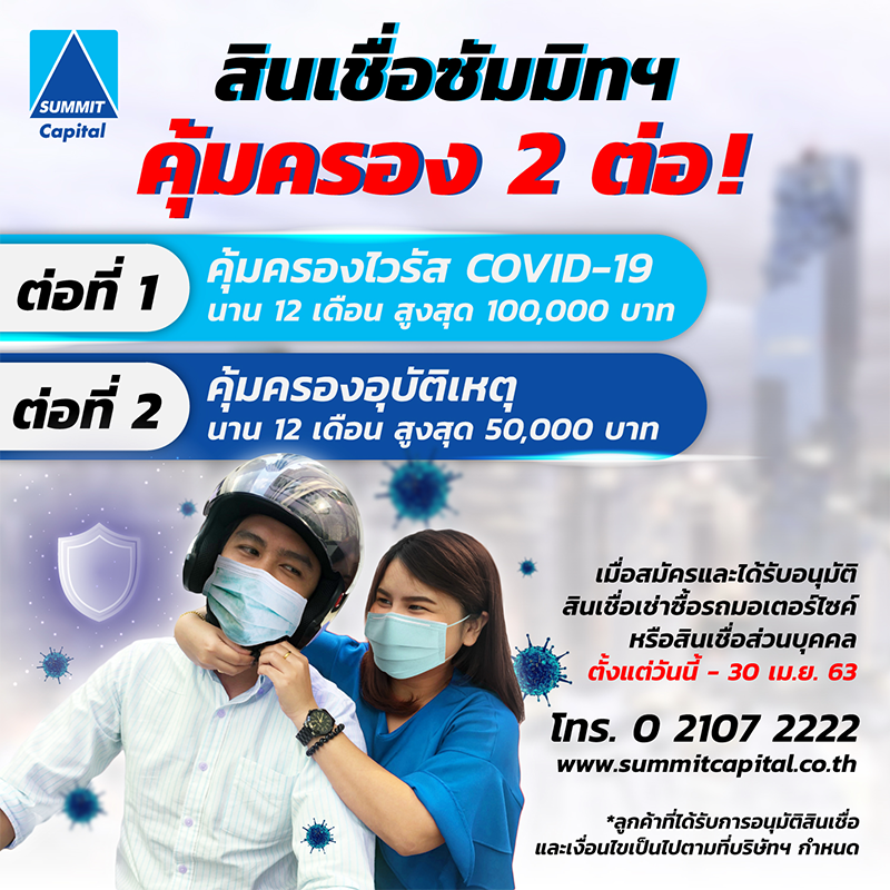 สำหรับผู้ที่สมัครสินเชื่อเช่าซื้อรถมอเตอร์ไซค์ หรือสินเชื่อส่วนบุคคลของซัมมิท แคปปิตอล ตั้งแต่วันนี้จนถึงวันที่ 30 เมษายน 2563 จะได้รับสิทธิ์ความคุ้มครองสุขภาพจากไวรัสโคโรนา (COVID-19) นาน 12 เดือน นับจากได้รับการอนุมัติสินเชื่อ ครอบคลุมค่ารักษาพยาบาลตามจริงสูงสุด 100,000 บาท พร้อมประกันอุบัติเหตุนาน 12 เดือน นับจากได้รับการอนุมัติสินเชื่อ ครอบคลุมความคุ้มครองสูงสุด 50,000 บาท ดูข้อมูลเพิ่มเติมได้ที่ www.summitcapital.co.th หรือโทร. 02-107-2222
