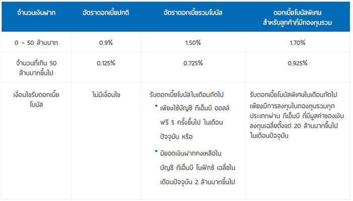 - ถอนหรือโอนเงินที่สาขา TMB ได้ 2 ครั้งต่อเดือน ครั้งถัดไปเสียค่าธรรมเนียมครั้งละ 50 บาท ค่าธรรมเนียมอื่นๆ เป็นไปตามประกาศธนาคาร