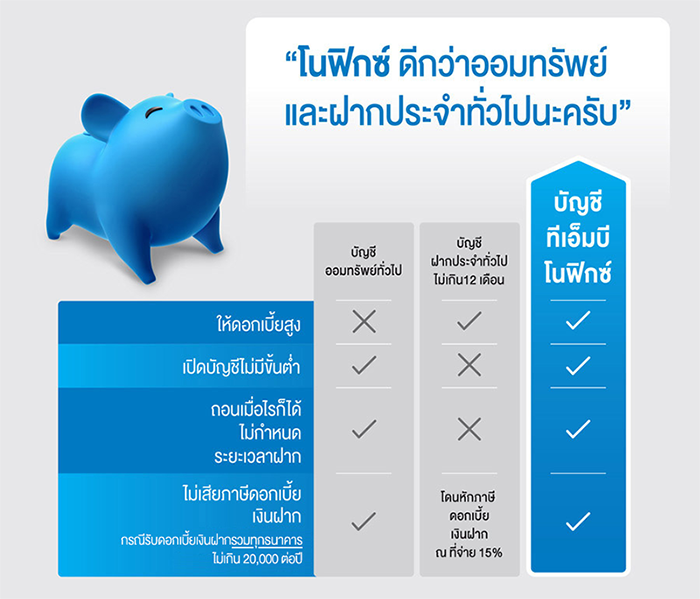 บัญชี ทีเอ็มบี โน ฟิกซ์ : อยากได้ดอกเบี้ยสูง ง่ายๆ กับทีเอ็มบี โน ฟิกซ์ บัญชีฝากไม่ประจำ ถอนได้ ดอกสูง เป็นบัญชีเพื่อการออมรูปแบบใหม่ ที่ตอบโจทย์ลูกค้าที่ต้องการดอกเบี้ยสูงเหมือนฝากประจำ และสามารถถอนได้เหมือนออมทรัพย์