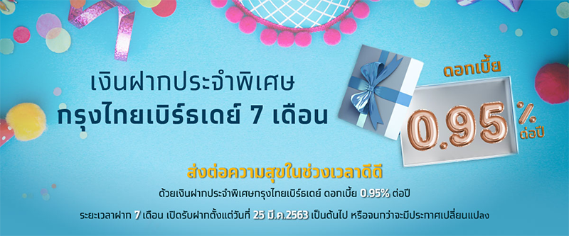 โปรโมชั่นพิเศษ!! เงินฝากประจำพิเศษกรุงไทยเบิร์ธเดย์ 7 เดือน อัตราดอกเบี้ย 0.95% ต่อปี