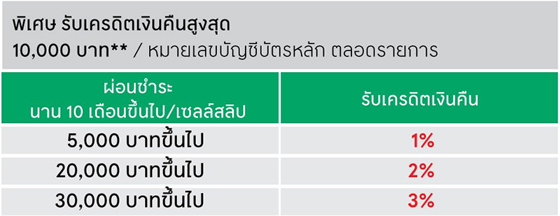 รับเครดิตเงินคืนสูงสุด 10,000 บาท/หมายเลขบัญชีบัตรหลัก ตลอดรายการ - ยอดผ่อนชำระ 5,000 บาทขึ้นไป/เซลล์สลิป/กรมธรรม์ นาน 10 เดือน รับเครดิตเงินคืน 1%