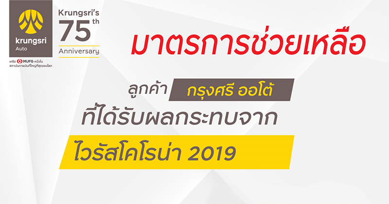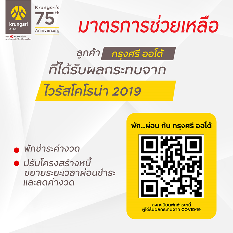 ศึกษารายละเอียดและเงื่อนไขเพิ่มเติมเกี่ยวกับมาตรการช่วยเหลือลูกค้าที่ได้รับผลกระทบจากการแพร่ระบาดของเชื้อไวรัส COVID-19 ได้ที่ https://www.krungsriauto.com/auto/interest/Financial-assistance-package.html