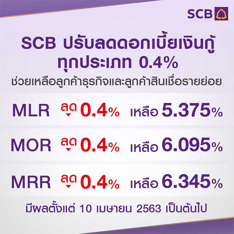 SCB ประกาศลดดอกเบี้ยเงินกู้ทุกประเภท 0.40% ช่วยเหลือลูกค้าธุรกิจและลูกค้าสินเชื่อรายย่อย 10 เม.ย. นี้