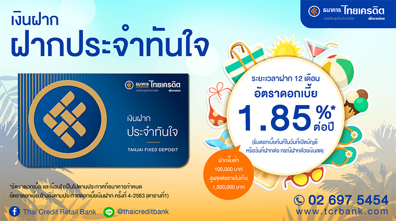 บัญชีเงินฝากประจำทันใจ ระยะเวลาการฝาก 12 เดือน อัตราดอกเบี้ย 1.85%* ต่อปี รับดอกเบี้ยทันทีในวันที่เปิดบัญชี วงเงินฝากขั้นต่ำ 100,000 บาท สูงสุดต่อรายไม่เกิน 1,500,000 บาท (*รักษายอดฝาก 12 เดือน)