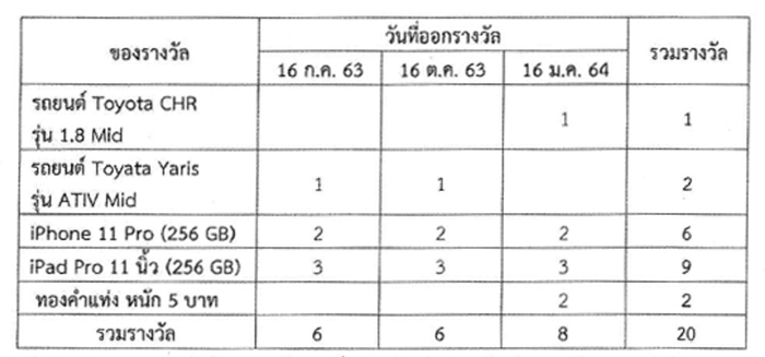 ของรางวัล : จำนวนทั้งสิ้น 20 รางวัล มูลค่าของรางวัลรวม 3,048,500 บาท