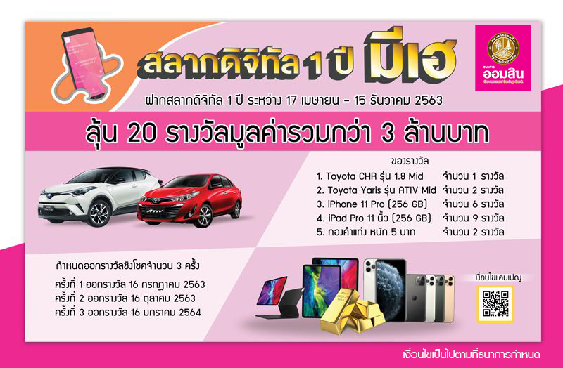 สลากดิจิทัล 1 ปีมีเฮ ฝากสลากดิจิทัลระหว่างวันที่ 17 เมษายน - 15 ธันวาคม 2563 ลุ้นรางวัลมูลค่ารวมกว่า 3 ล้านบาท