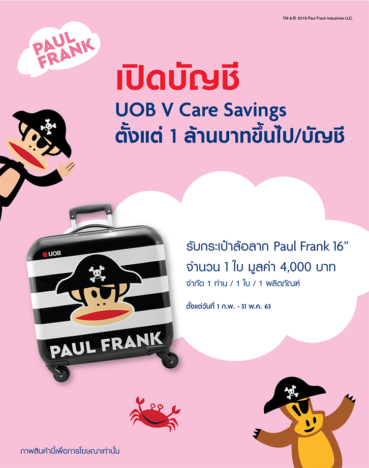 บัญชีเงินฝากออมทรัพย์ยูโอบี วีแคร์ (UOB Vcare) กับธนาคารยูโอบี และคงยอดเงินฝาก 1 ล้านบาทเป็นต้นไป ติดต่อกันตามระยะเวลาที่กำหนด จะได้รับ Paul Frank Trolley Bag 16 นิ้ว จำนวน 1 ใบ มูลค่า 4,000 บาท