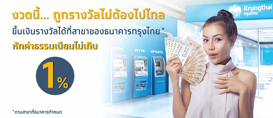 งวดนี้... ถูกรางวัลไม่ต้องไปไกล ขึ้นเงินรางวัลได้ที่สาขาของธนาคารกรุงไทย* หักค่าธรรมเนียมไม่เกิน 1%