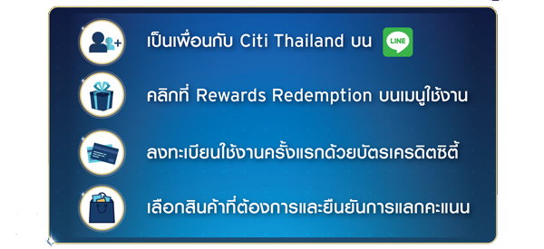 เงื่อนไขธนาคารซิตี้แบงก์ - Rewards Redemption บน Citi LINE Connect เป็นรายการส่งเสริมการขายที่ให้ผู้ถือบัตรสามารถแลกคะแนนสะสมในบัตรกับสินค้าและบริการที่ร่วมรายการภายในระยะเวลาส่งเสริมการขาย ไม่สามารถขอแลกเปลี่ยนเป็นเงินสดเพื่อชำระค่าใช้จ่ายได้โดยตรงแต่อย่างไร