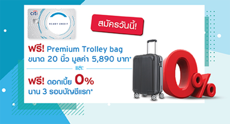 - เมื่อมียอดกดเงินสดผ่านบัญชีซิตี้ เรดดี้เครดิต ครบ 5,000 บาท ภายใน 60 วัน หลังได้รับอนุมัติบัญชีฯ หรือมีรายการแบ่งชำระผ่านระบบ Citi Paylite อย่างน้อย 1 รายการ รับกระเป๋าเดินทาง Premium Trolley Bag ขนาด 20 นิ้ว มูลค่า 5,890 บาท
