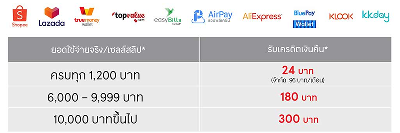 - ยอดเครดิตเงินคืนจะคำนวณเฉพาะยอดใช้จ่ายจาก 10 เว็บไซต์ ที่ร่วมรายการ ได้แก่ Lazada, True Money, Top Value, Shopee, Easy Bill, Airpay, AliExpress, BluePay, KLOOK, KKDAY เท่านั้น