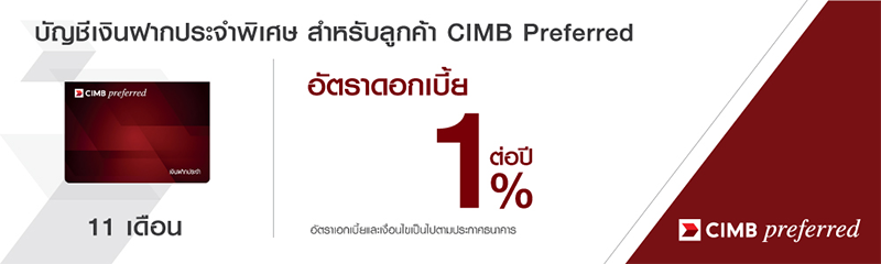 บัญชีเงินฝากประจำพิเศษ 5, 11 เดือน CIMB Preferred and CIMB Thai Private Banking สำหรับลูกค้า CIMB Preferred หรือ CIMB Thai Private Banking ประเภทลูกค้าบุคคลธรรมดาเท่านั้น หรือสมัครเป็นลูกค้า CIMB Preferred หรือ CIMB Thai Private Banking ในวันและเวลาเดียวกันกับการขอเปิดบัญชี