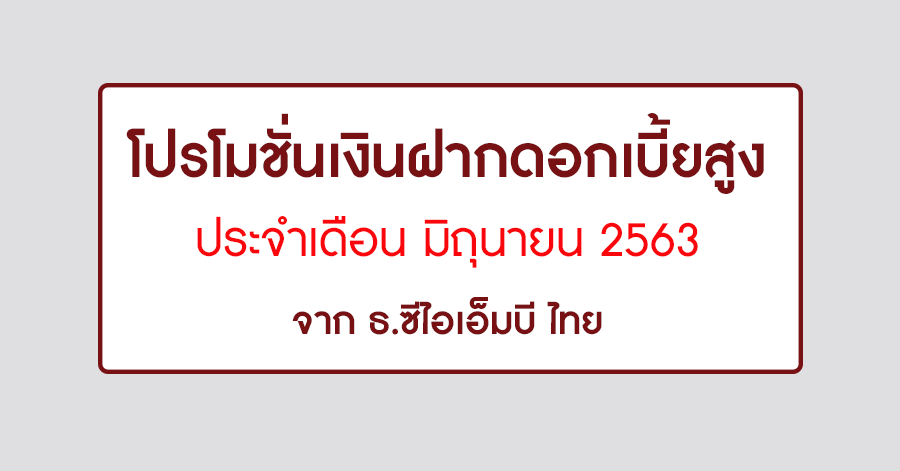 โปรโมชั่นบัญชีเงินฝากดอกเบี้ยสูงประจำเดือนมิถุนายน 2563 จาก ธนาคารซีไอเอ็มบี ไทย บัญชีเงินฝากประจำแบบมีกำหนดระยะเวลาที่ให้ดอกเบี้ยสูง และสามารถเลือกรับดอกเบี้ยแบบรายเดือน หรือเมื่อครบกำหนดได้