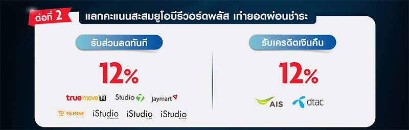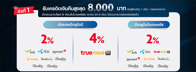 - ต่อที่ 2 รับส่วนลดทันที/ เครดิตเงินคืน 12% เมื่อแลกคะแนนสะสมยูโอบีรีวอร์ดพลัส เท่ากับยอดผ่อนชำระต่อเซลส์สลิป เฉพาะบัตรเครดิตยูโอบี (ยกเว้น บัตรเครดิตยูโอบี โยโล่ แพลตินัม) รายละเอียดการแลกคะแนนสะสมยูโอบีรีวอร์ดพลัส เพื่อรับส่วนลดทันที/เครดิตเงินคืน ตามที่ระบุในต่อที่ 2 ด้านหน้าสื่อโฆษณา