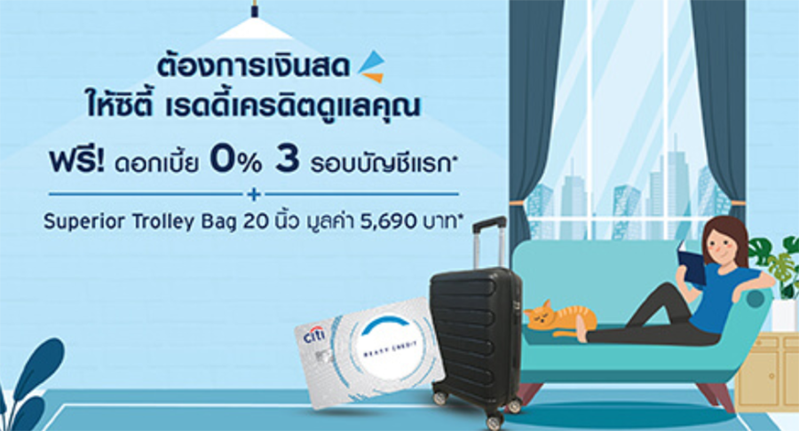 โปรโมชั่นพิเศษ...กดเงินสดฟรี ดอกเบี้ย 0% 3 รอบบัญชีแรก และรับฟรี! กระเป๋าเดินทาง Superior Trolley Bag ขนาด 20 นิ้ว มูลค่า 5,690 บาท สำหรับสมัครบัญชีซิตี้ เรดดี้เครดิต ผ่านทางออนไลน์
