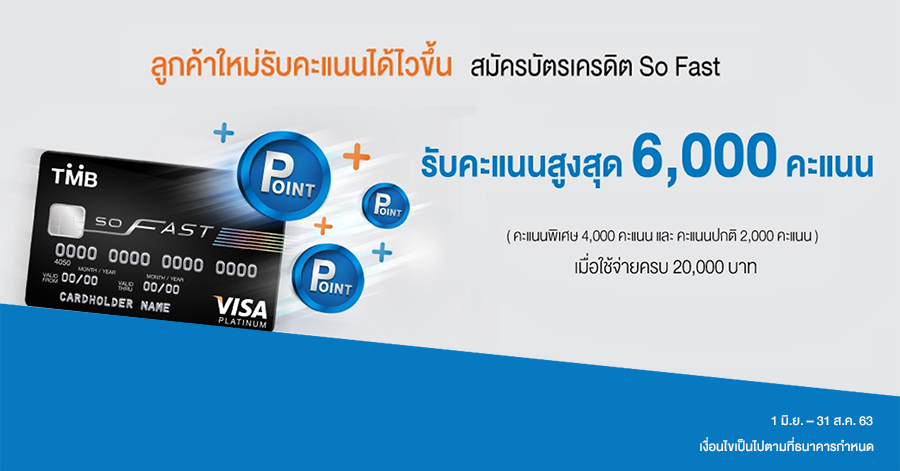 บัตรเครดิต ทีเอ็มบี โซ ฟาสต์ (TMB So Fast Credit Card) วันนี้!! รับคะแนนสูงสุด 6,000 คะแนน (คะแนนพิเศษ 4,000 คะแนน และคะแนนปกติ 2,000 คะแนน) เมื่อมียอดใช้จ่ายผ่านบัตรครบ 20,000 บาท ภายใน 60 วัน นับจากวันที่บัตรได้รับการอนุมัติฯ