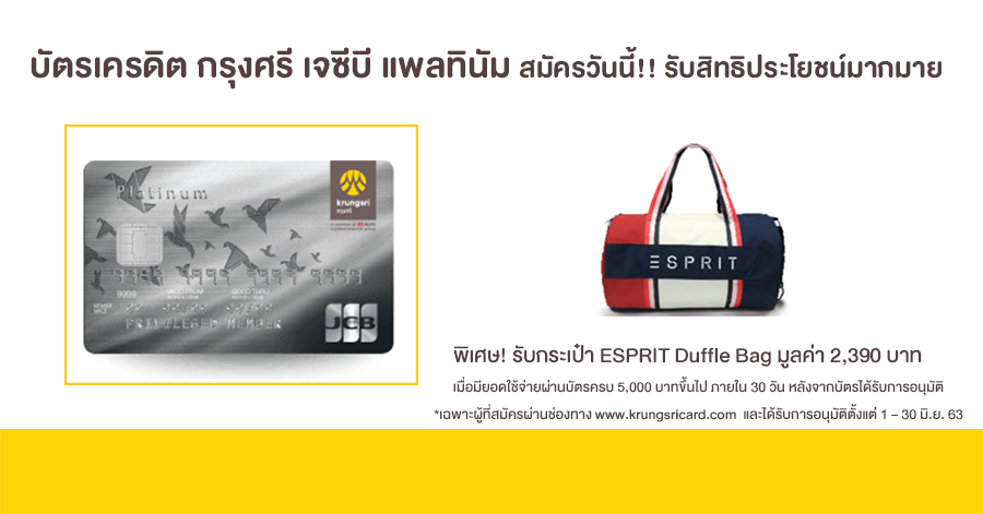 บัตรเครดิต กรุงศรี เจซีบี แพลทินัม สมัครวันนี้!! รับกระเป๋า ESPRIT Duffle Bag* มูลค่า 2,390 บาท