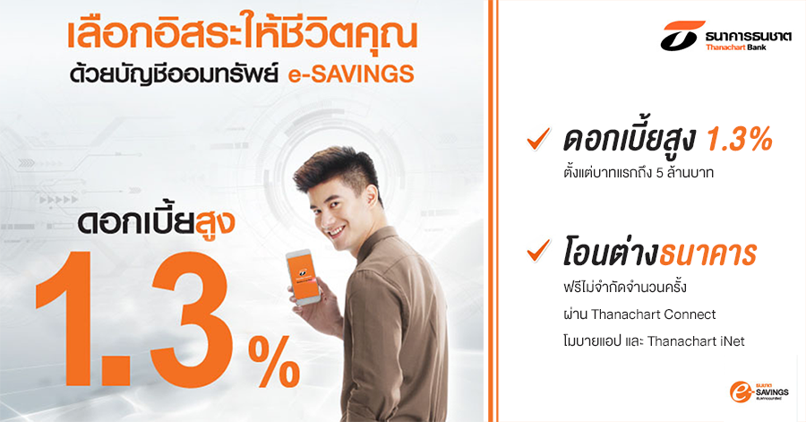 เลือกชีวิตอิสระได้ กับบัญชีเงินฝากออมทรัพย์ e-Savings จาก ธ.ธนชาต ให้ดอกเบี้ยสูงสุดถึง 1.3% ต่อปี