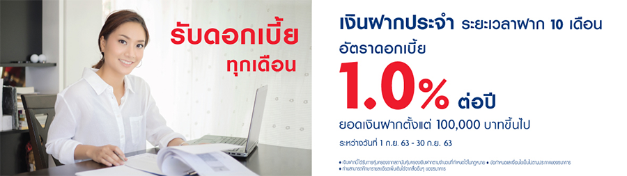 เงื่อนไขสำคัญ - อัตราดอกเบี้ยพิเศษนี้สำหรับลูกค้าประเภทบุคคลธรรมดาที่มาเปิดบัญชีประเภทเงินฝากประจำ ระยะเวลาฝาก 10 เดือน ด้วยยอดเงินฝากตั้งแต่ 100,000 บาท ระหว่างวันที่ 1 - 30 กันยายน 2563 ที่ธนาคารยูโอบีทุกสาขา