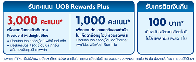 A.รับคะแนน UOB Rewards Plus 3,000 คะแนน/รับกระเป๋าเดินทาง President Midnight Blue 4 ล้อ ขนาด 20 นิ้ว มูลค่า 4,990 บาท
