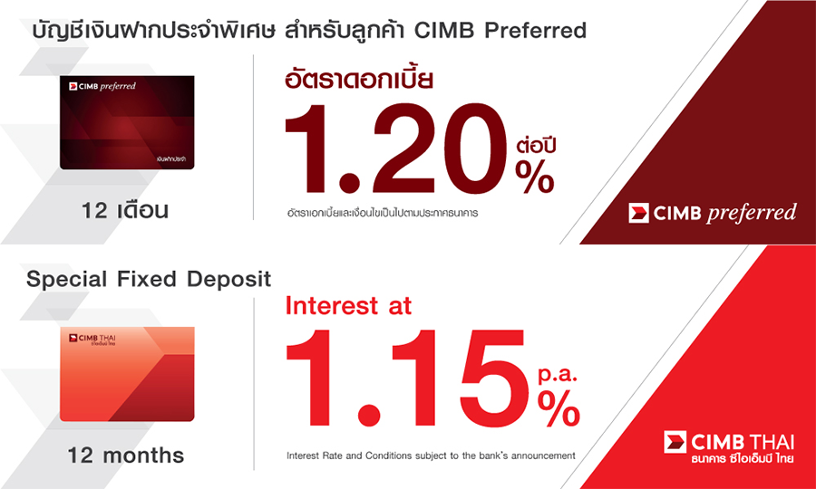 - บัญชีเงินฝากประจำพิเศษ 5, 12 เดือน Preferred* เป็นบัญชีสำหรับลูกค้า CIMB Preferred หรือสำหรับลูกค้า CIMB Thai Private Banking ประเภทลูกค้าบุคคลธรรมดาเท่านั้น หรือสมัครเป็นลูกค้า CIMB Preferred หรือ CIMB Thai Private Banking ในวันและเวลาเดียวกันกับการขอเปิดบัญชี