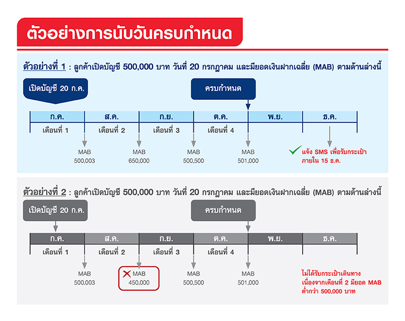 - ธนาคารจะส่ง SMS แจ้งไปยังหมายเลขโทรศัพท์มือถือที่ให้ไว้กับธนาคารภายใน 45 วัน นับจากวันสิ้นเดือนที่ 4 เพื่อรับกระเป๋าเดินทาง ณ สาขาที่เปิดบัญชี