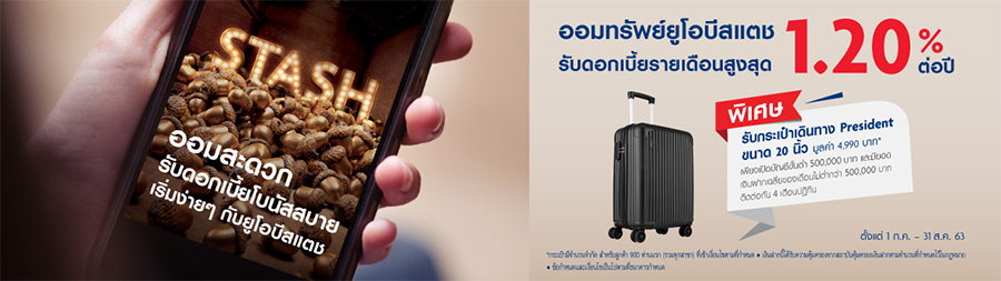 บัญชีเงินฝากออมทรัพย์ยูโอบีสแตช (UOB STASH) ทางเลือกใหม่สำหรับการออมเงินกับบัญชีออมทรัพย์แบบไม่มีสมุดคู่ฝาก พิเศษ! ออมวันนี้...รับกระเป๋าเดินทาง President ขนาด 20 นิ้ว มูลค่า 4,990 บาท เพียงเปิดบัญชีขั้นต่ำ 500,000 บาท และมียอดเงินฝากเฉลี่ยของเดือนไม่น้อยกว่า 500,000 บาท ติดต่อกัน 4 เดือนปฏิทิน