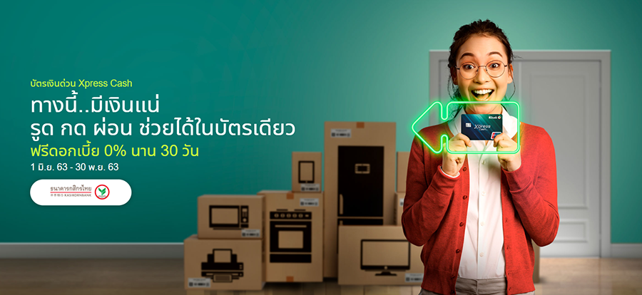 - ลูกค้าที่เข้าร่วมโครงการ ต้องเป็นลูกค้าใหม่ที่มีรายได้ประจำ หรือเป็นลูกค้าผู้มีบัญชีเงินเดือนผ่านธนาคารกสิกรไทย (KBank Payroll) และยื่นสมัครสินเชื่อบัตรเงินด่วน Xpress Cash ระหว่างวันที่ 1 มิ.ย. 63 - 30 พ.ย. 63
