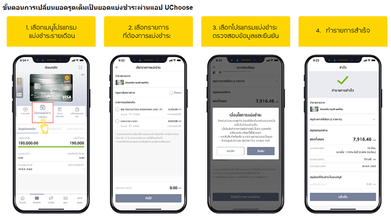 - ลูกค้าต้องรูดบัตรเครดิตฯ ชำระค่าสินค้าแบบเต็มจำนวน แล้วจึงทำรายการเปลี่ยนเป็นแบ่งชำระได้ภายหลัง ช่องทางแอปฯ UChoose หรือติดต่อทำรายการผ่านศูนย์บริการหลังบัตร