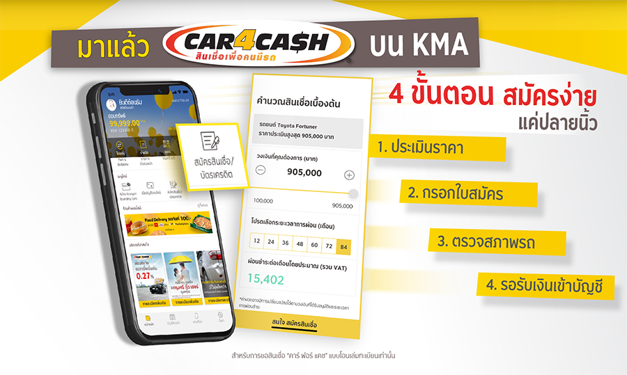 คาร์ ฟอร์ แคช บนแอป KMA ขอสินเชื่อเพื่อคนมีรถง่ายๆ แค่ปลายนิ้ว ให้ชีวิตก้าวต่อ ไม่มีสะดุด