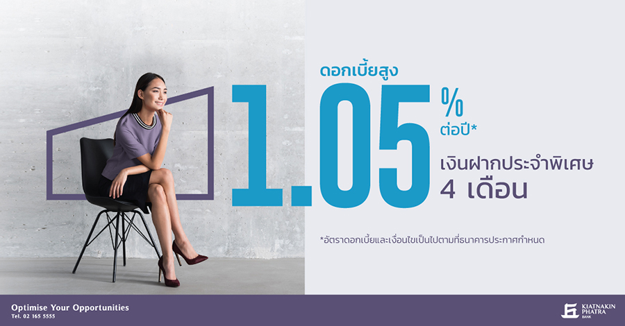 โปรโมชั่นบัญชีเงินฝากประจำพิเศษ 4 เดือน จาก ธ.เกียรตินาคินภัทร ให้ดอกเบี้ยสูง 1.05% ต่อปี