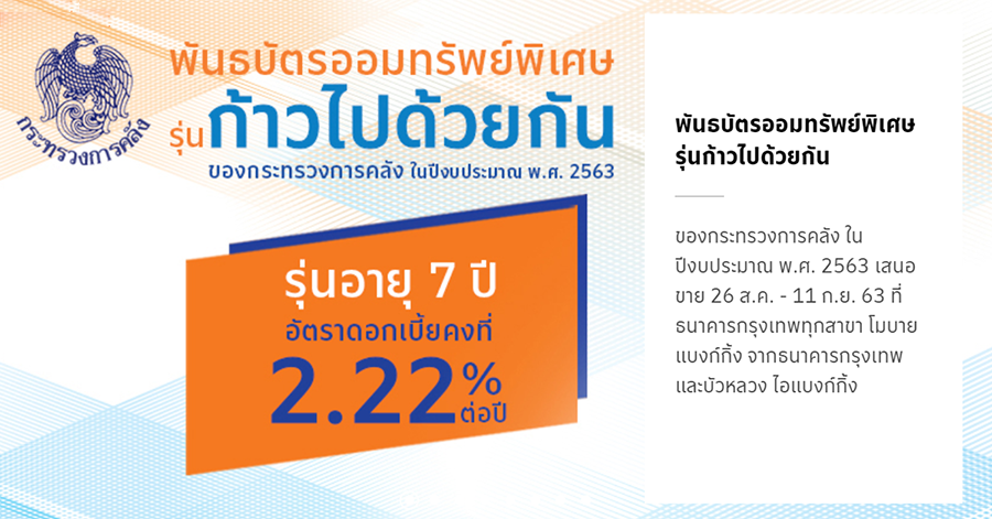ลงทุนอย่างมั่นใจกับพันธบัตรออมทรัพย์พิเศษรุ่นก้าวไปด้วยกัน ของกระทรวงการคลัง ในปีงบประมาณ พ.ศ. 2563 รุ่นอายุ 7 ปี อัตราดอกเบี้ยคงที่ 2.22% ต่อปี