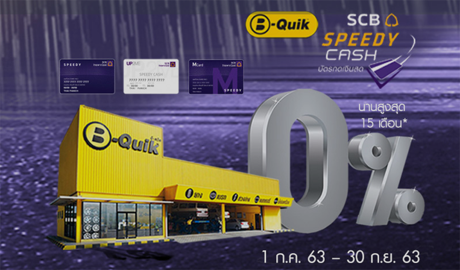 เงื่อนไข - สิทธิพิเศษสำหรับผู้ถือบัตร Speedy Cash ทุกประเภท ยกเว้นบัตร Speedy Cash Plus และ Speedy Cash Prompt ธนาคารไทยพาณิชย์ จำกัด (มหาชน) ("ธนาคาร") ที่มีหมายเลขบัตร 777777xx xxxxxxxx ("ผู้ถือบัตร") เมื่อชำระค่าสินค้าที่ร่วมรายการที่ร้านบี-ควิก ทุกสาขา ตั้งแต่วันที่ 1 กรกฎาคม 2563 ถึง วันที่ 30 กันยายน 2563 รับสิทธิดังนี้