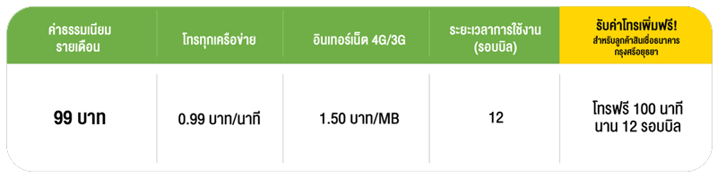 - ค่าบริการส่วนเกินจาก 100 นาที คิดตามแพ็กเกจหลัก 0.99 บาท/ นาที