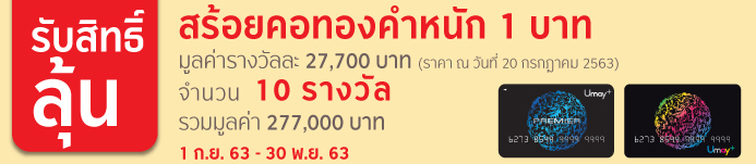 บัตรกดเงินสดยูเมะพลัส...ถอนเงินสดที่ตู้กรุงศรี เอทีเอ็ม รับสิทธิ์ลุ้นสร้อยคอทองคำหนัก 1 บาท มูลค่ารางวัลละ 27,700 บาท (ราคา ณ วันที่ 20 กรกฎาคม 2563) จำนวน 10 รางวัล รวมมูลค่า 277,000 บาท ตั้งแต่วันที่ 1 ก.ย. 63 - 30 พ.ย. 63