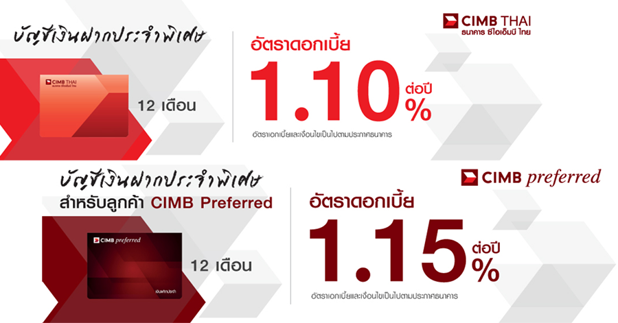 - บัญชีเงินฝากประจำพิเศษ 12 เดือน Preferred* เป็นบัญชีสำหรับลูกค้า CIMB Preferred หรือสำหรับลูกค้า CIMB Thai Private Banking ประเภทลูกค้าบุคคลธรรมดาเท่านั้น หรือสมัครเป็นลูกค้า CIMB Preferred หรือ CIMB Thai Private Banking ในวันและเวลาเดียวกันกับการขอเปิดบัญชี